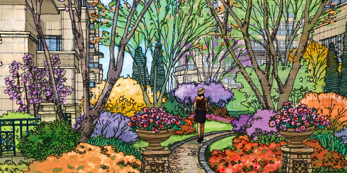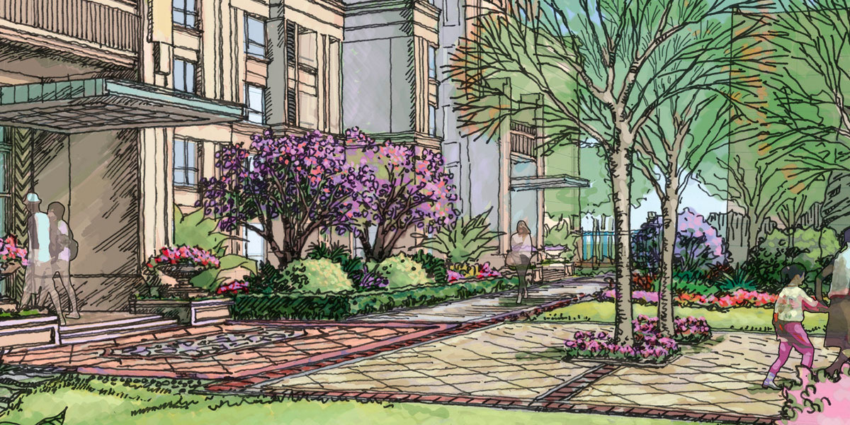 景观设计是用科学、理性、艺术的手法系统地协调人与自然关系;我们的愿望是用自然的精神、专业的态度创造健康、舒适、安全的环境 ;源于法式古典的简约的ART-DECO建筑立面让品质更显尊贵。入口百米的银杏大道、规整的线性喷泉以充满仪式感的方式展示景观的品质和回家的归属感;近千平米水域面积的主景观区湖光山色更加奠定了大气的品质基调,山水相依、动静皆宜,一副展开的大气花卷;而林语秋歌主题景观区,则以更加自由、放松为我们提供健康的方式,这这里你可以找适合你的放松方式。来到邻里花园,是精致的草坪、小喷泉、景观构筑的邻里花园,在家门前也能享受更多的自然。而作为低密度的洋房区,我们更多想呈现私密、安全、人性、静谧的花园感,打造专属景观,更多需要从每一个细节出发,从身边每一株植物、每盏灯、每条小路出发,关爱使用者的安全与需求。