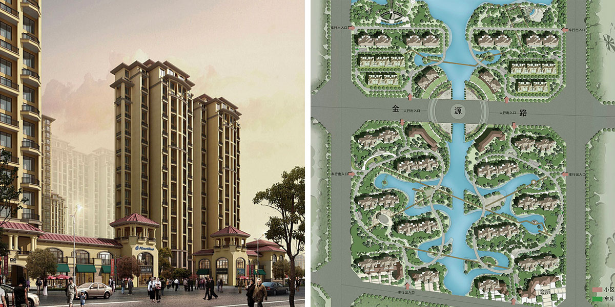 项目位于苏州市相城区老的中心区以西,由四个几何四边形地块组成,东邻玉成小区,南邻恒基商业用地及春申湖东路,西侧为规划道路,北侧为绿化景观带并邻近朝阳河。规划整体是将原本凌乱的四个地块整合为以一个商业广场为中心,龙凤两条水系环绕呼应而成的,富有江南水乡诗意且灵动的优美画卷。整体布局以“龙兴凤举”为设计依托,北侧用地我们充分利用朝阳河以及清水河的景观资源布置了叠拼别墅,花园洋房和大户型高层住宅,天际线高低错落,空间上生动活泼。一个圆形中心广场联系南北地块,使之成为一个有着统一鲜明标志和相关景观语境的整体。
