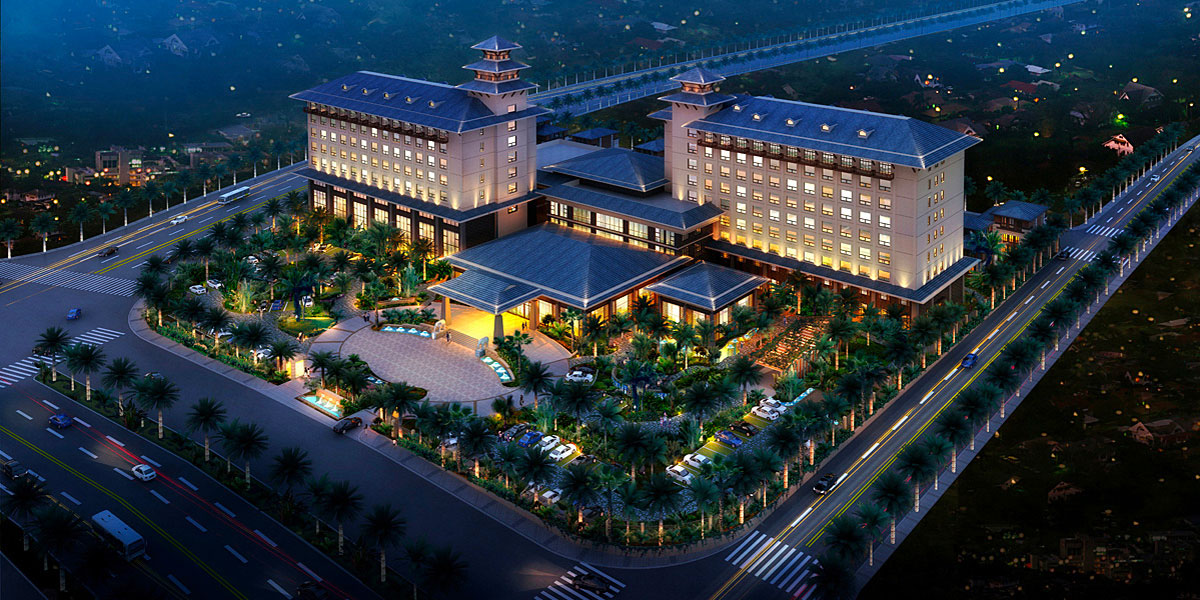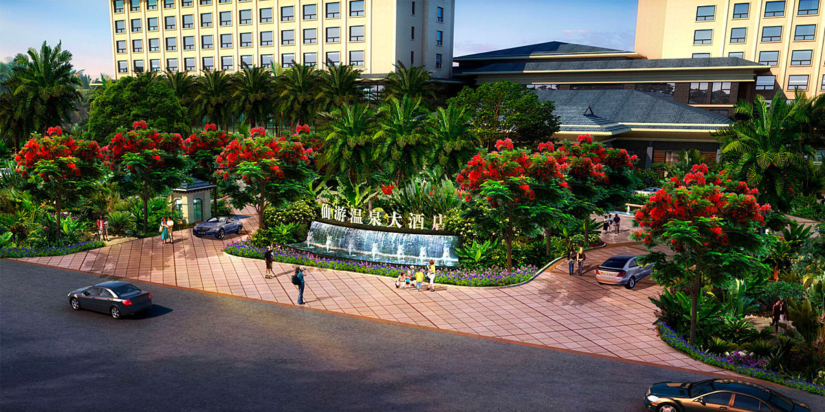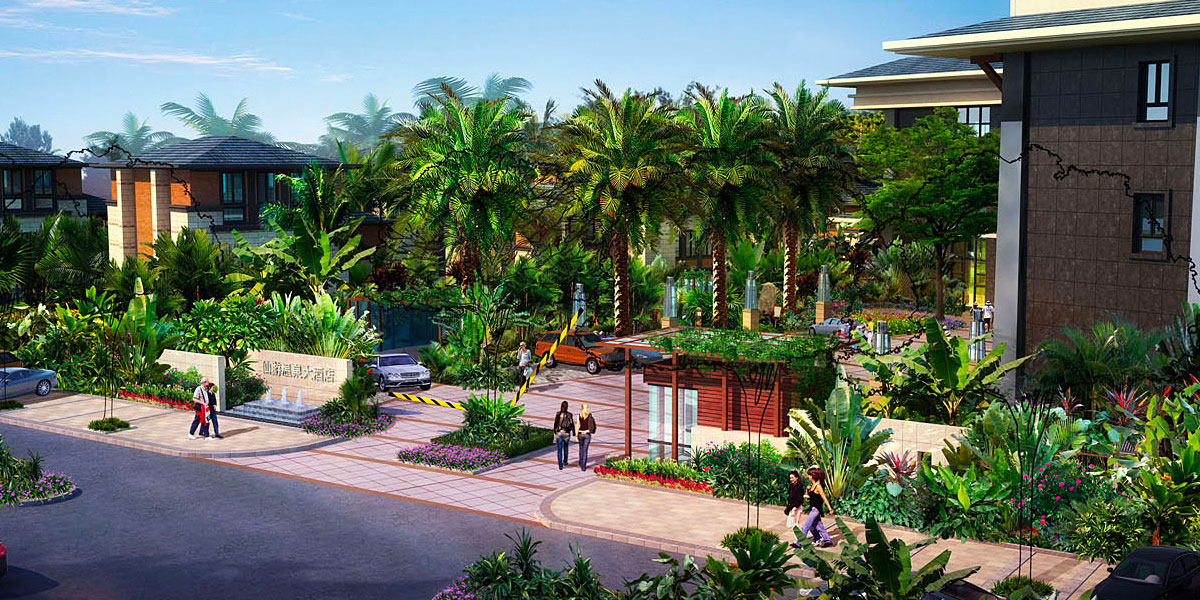 酒店建筑风格为东南亚风格,建筑风格符合休闲娱乐酒店的项目定位,在本区域具有景观特殊性。景观设计理念是让人享受阳光、风、水、植物的四季之美,为人提供平等、共享的绿色室外交流空间,为人与人交往提供舞台,与建筑和谐一体,一脉相承。
