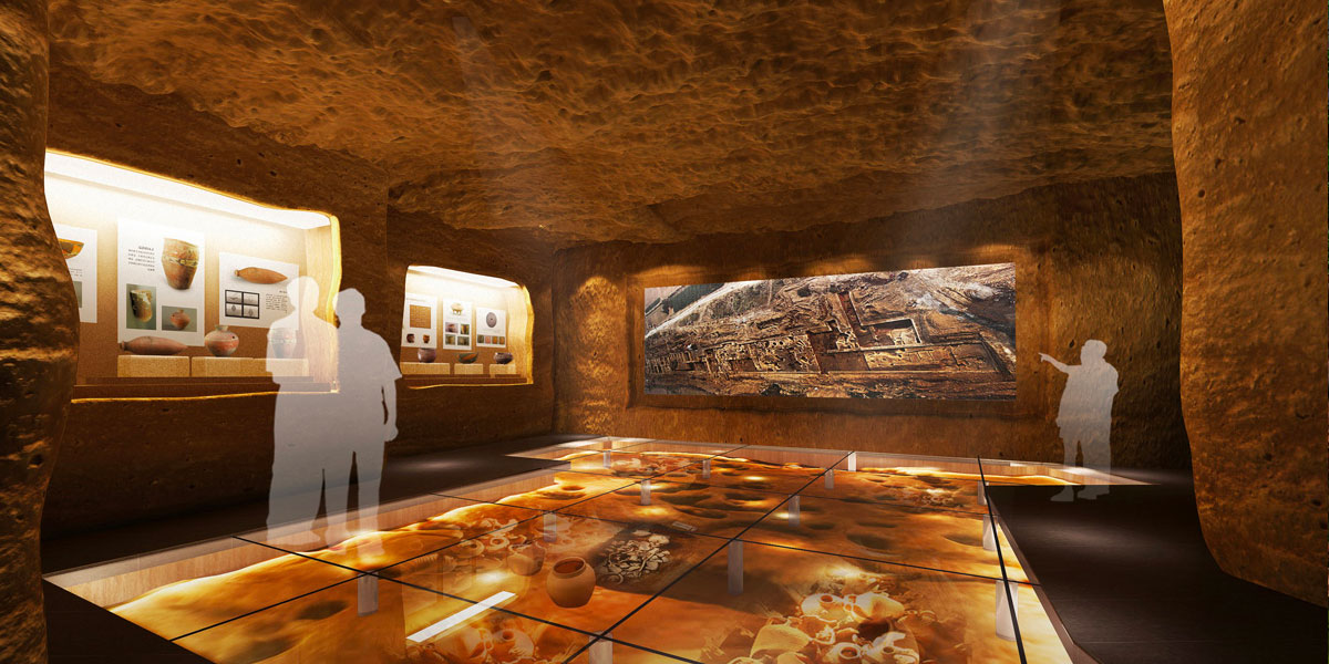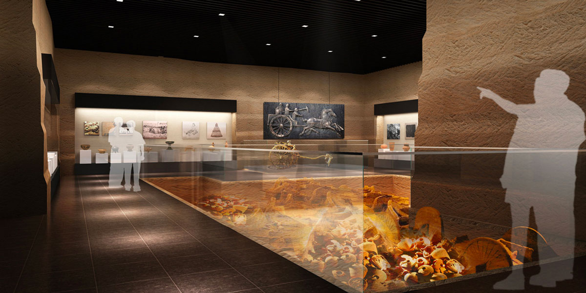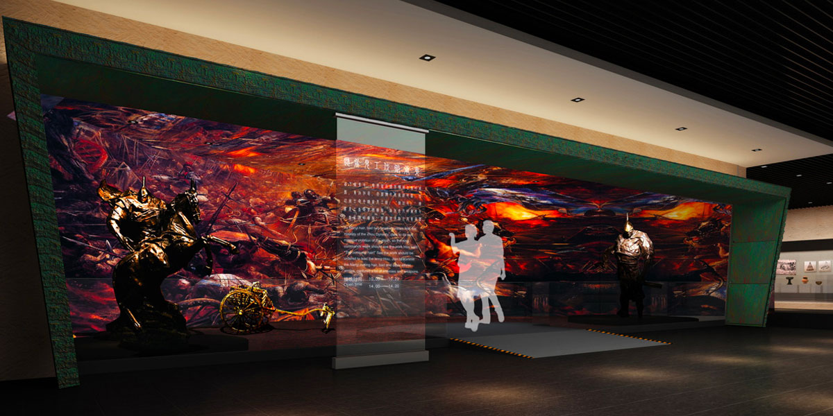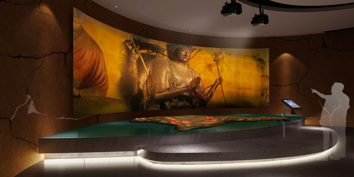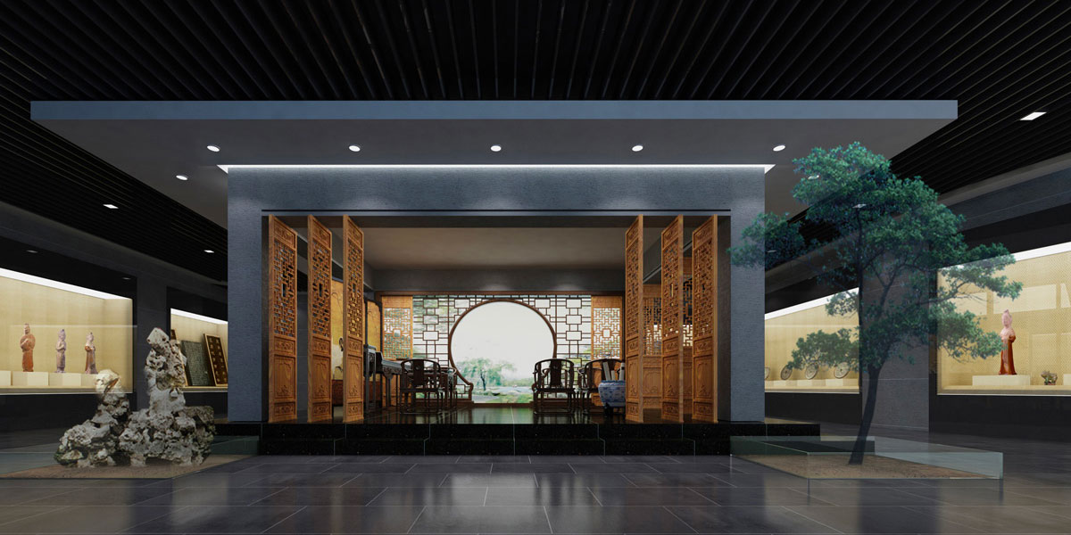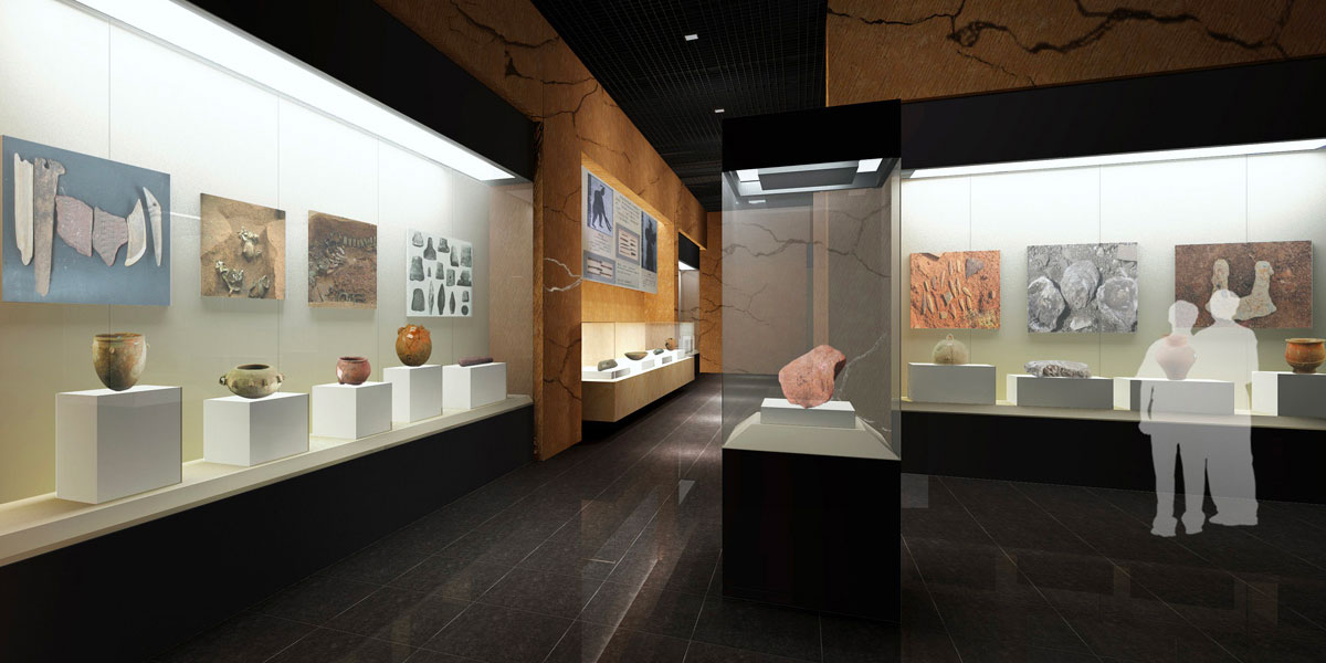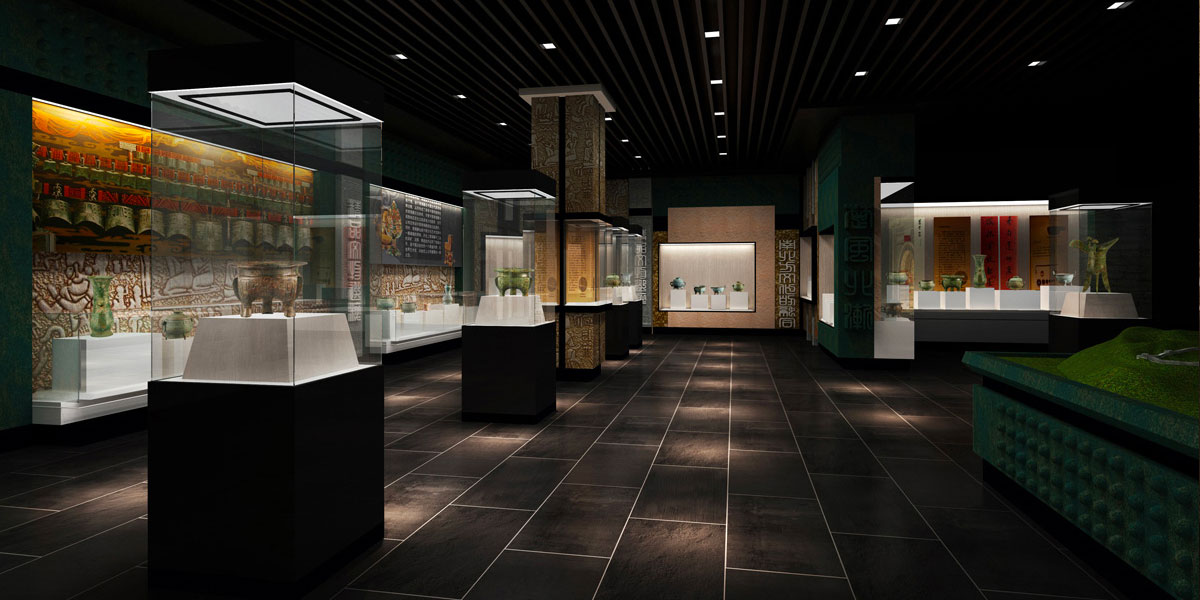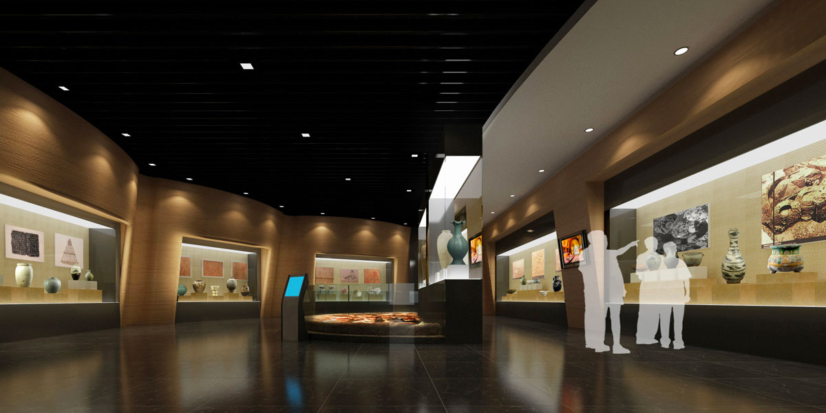展馆主展区分为两层,展陈的平面布局注重展陈的节奏把控,我们将展示内容分为史前文明、春秋战国、楚汉、唐至清四大历史脉络。根据时代特色及所展出文物的特点的异同,通过点、线、面的空间布局及展线设计方法勾勒出适合于每一个展厅的主题风格。一层展区设有大厅、山下故原、应国印象;二层展区设有楚汉风云、瓷都万象。在平面布局及参观流线上,突出重点展示内容,空间布局疏密有致。每个展厅打破传统呆板的布局模式,文物展示区相对紧凑,丰富,场景及多媒体展示区开放,大气,形成张弛有度的节奏变化。